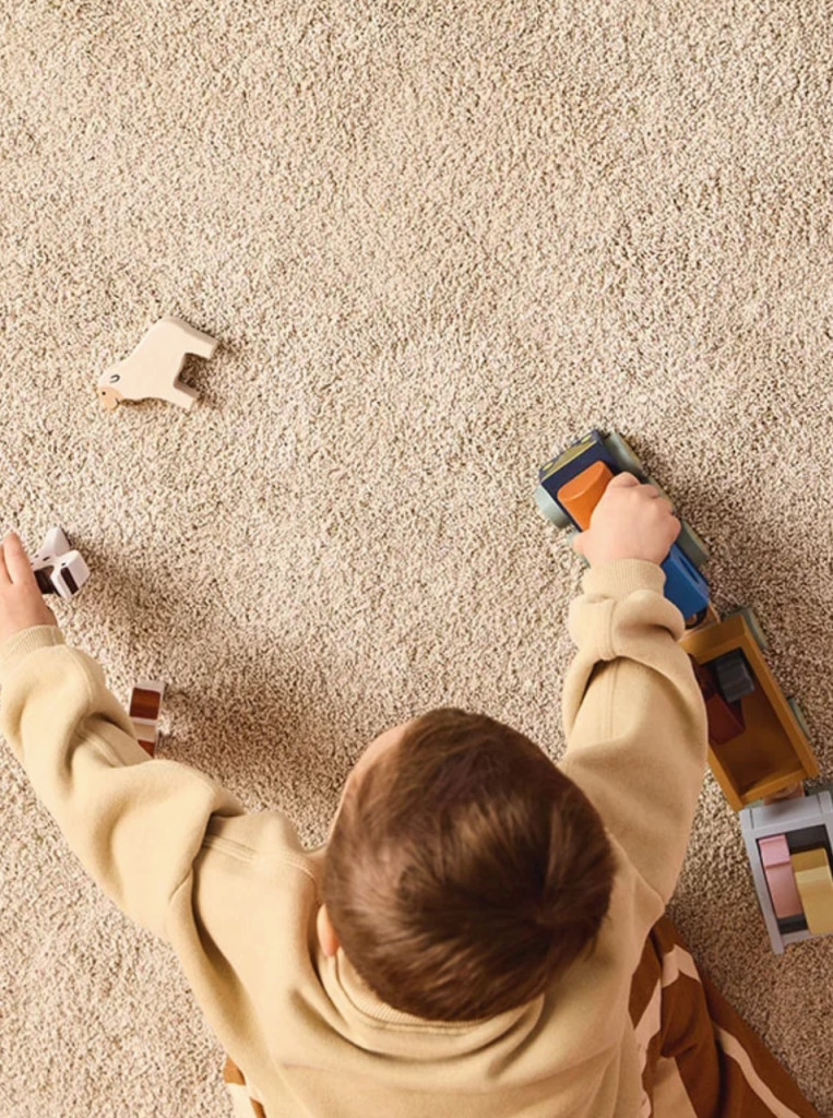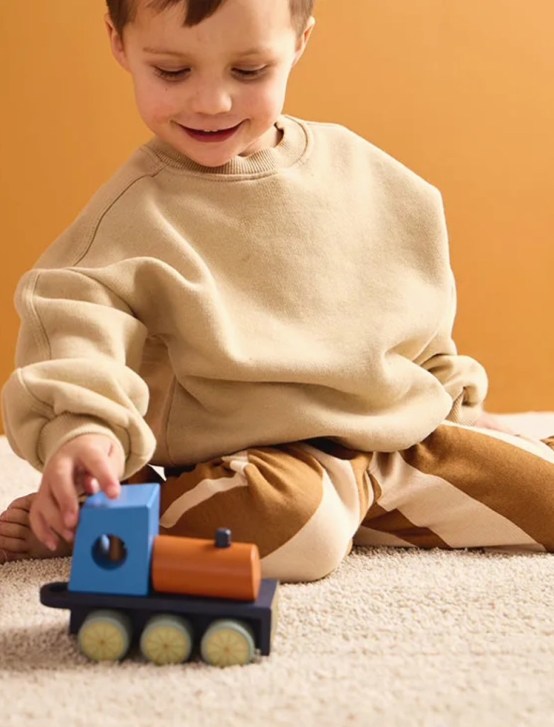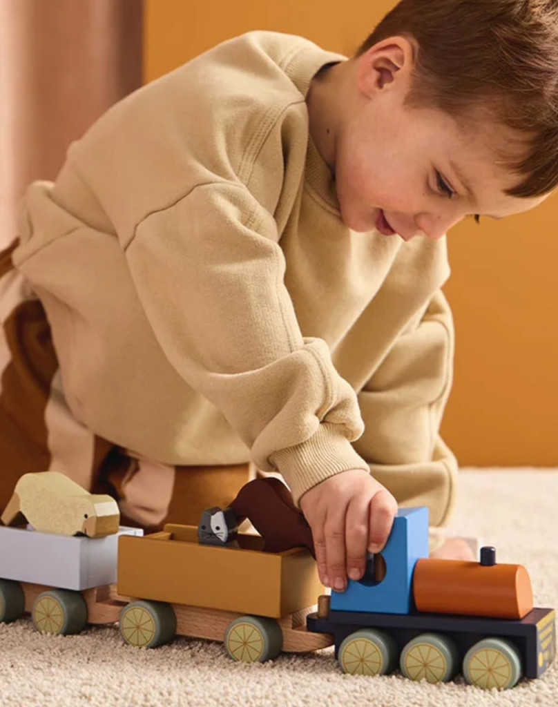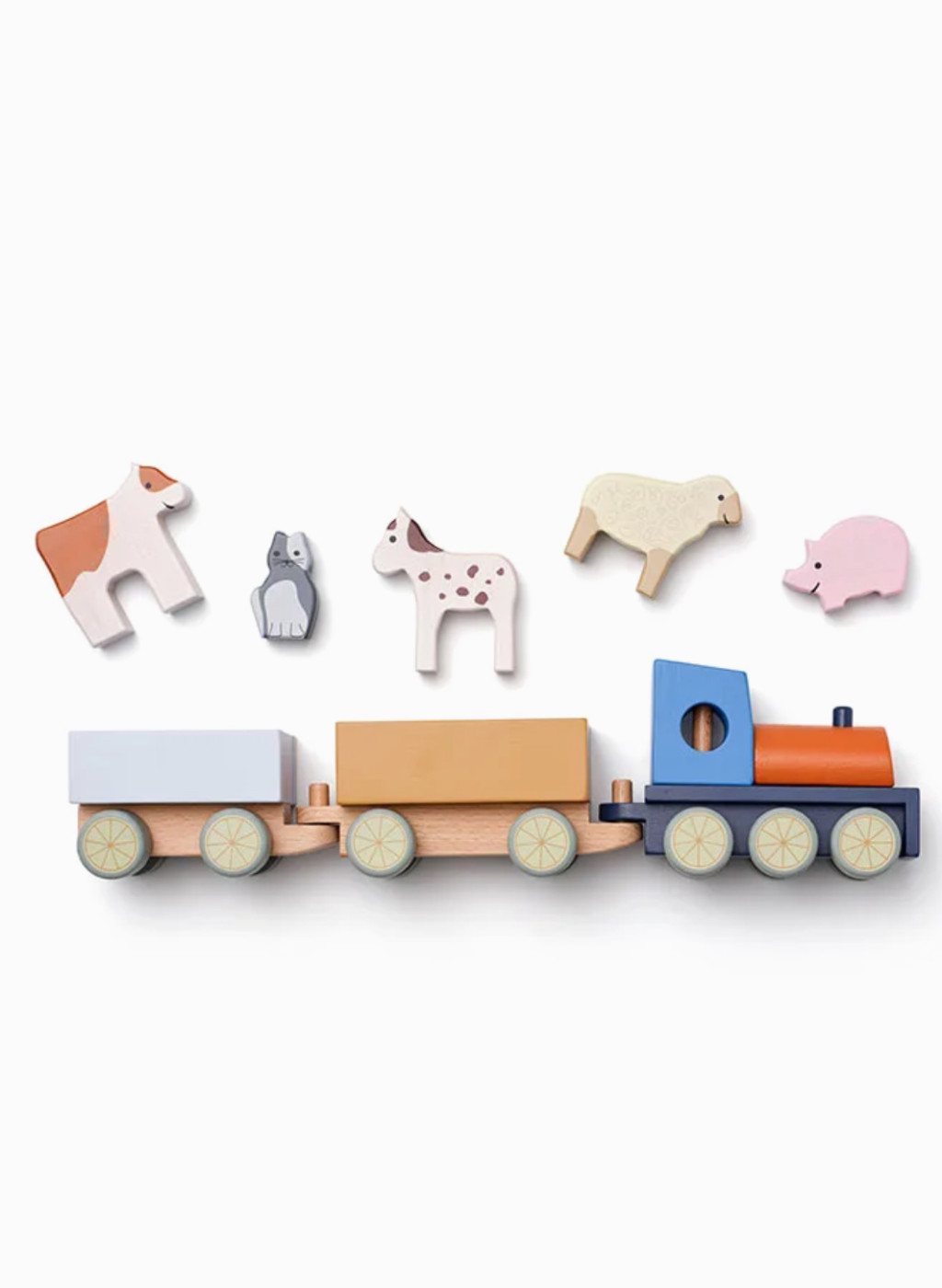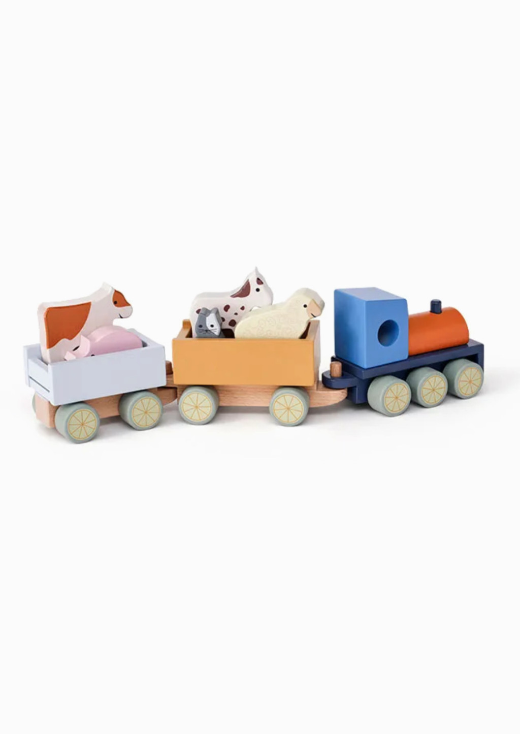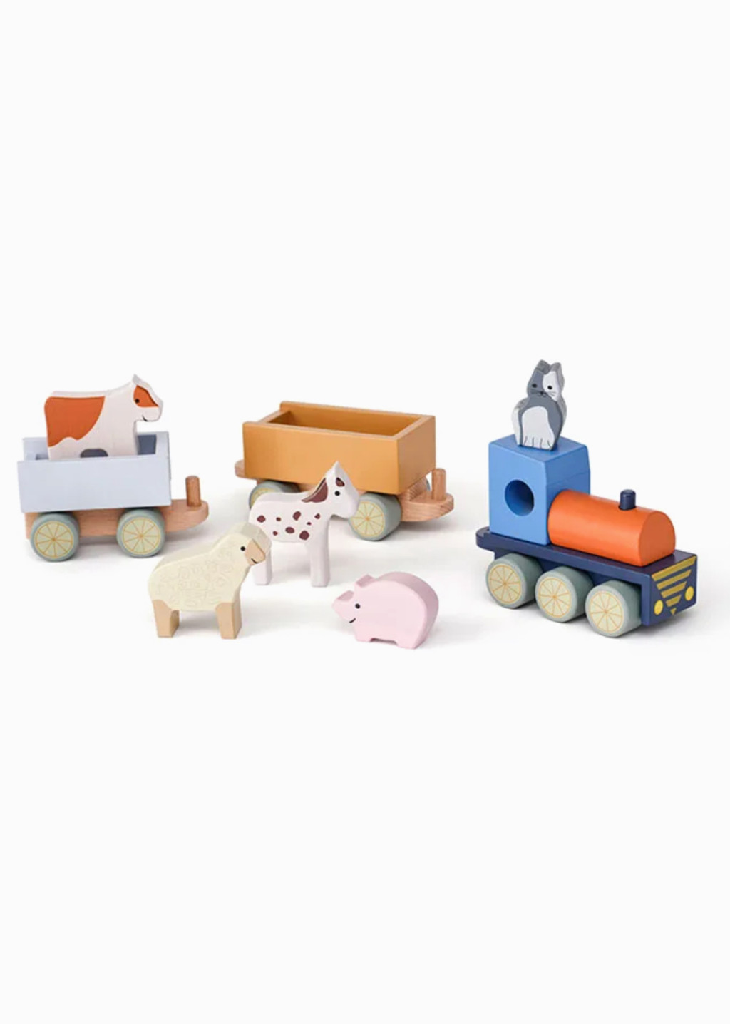 Mind a tanyasi vonat fedélzetén! Ehhez a fából készült vonathoz két kocsi tartozik, amelyeket öt haszonállat szállítására terveztek: Mira a tehén, Max a ló, Poppy a disznó, Bella a bárány és Sture a macska. A gyerekek bepakolhatják az állatokat a kocsikba, és elkészíthetik saját történeteiket, miközben tolják a vonatot. Az állatok különböző módon mozgathatók és elhelyezhetők, rengeteg játéklehetőséget kínálva. A vonat három egymásra rakható fahasábot is tartalmaz, amelyek még élvezetesebbé teszik a válogatást, egymásra rakást és egyensúlyozást. 12 hónapos korukban a gyerekek elkezdik fejleszteni a koordinációt, miközben kitalálják, hogyan illeszthetik a helyükre az állatokat és a blokkokat. Ez a vonat gyakorlatias játékra ösztönöz, miközben tologatják, és különféle játékmódokat fedeznek fel.