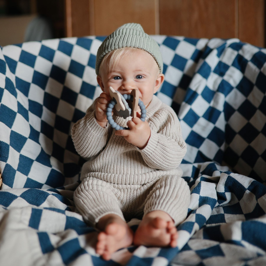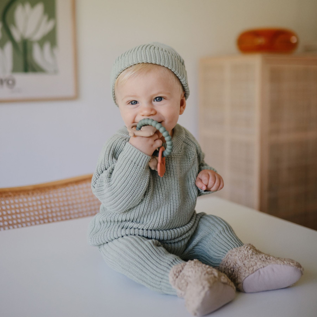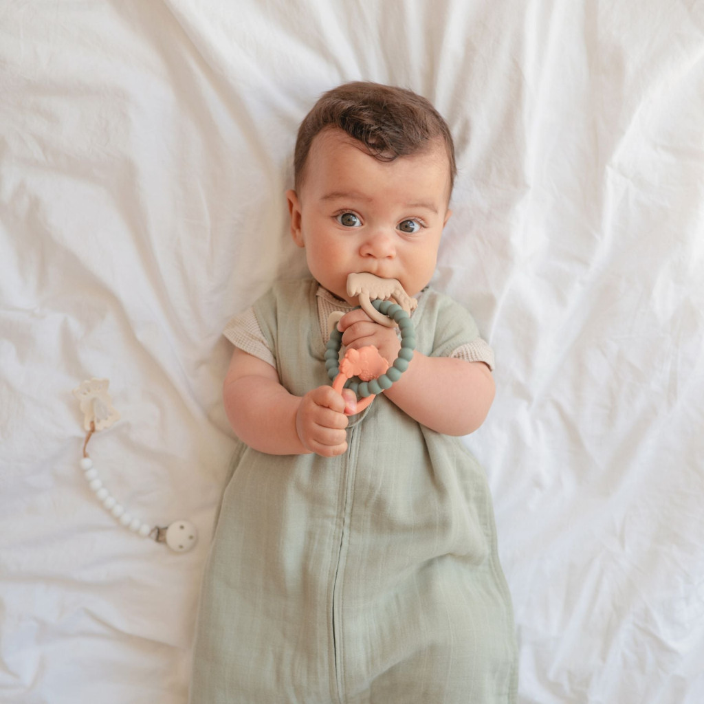 A rágóka különböző formákkal és textúrákkal rendelkezik, melyek masszírozzák a baba ínyét, enyhítve a fogzás fájdalmait. A kiegészítő élelmiszeripari szilikonból készül. Kialakításának köszönhetően használata biztonságos a kisgyermekek számára.