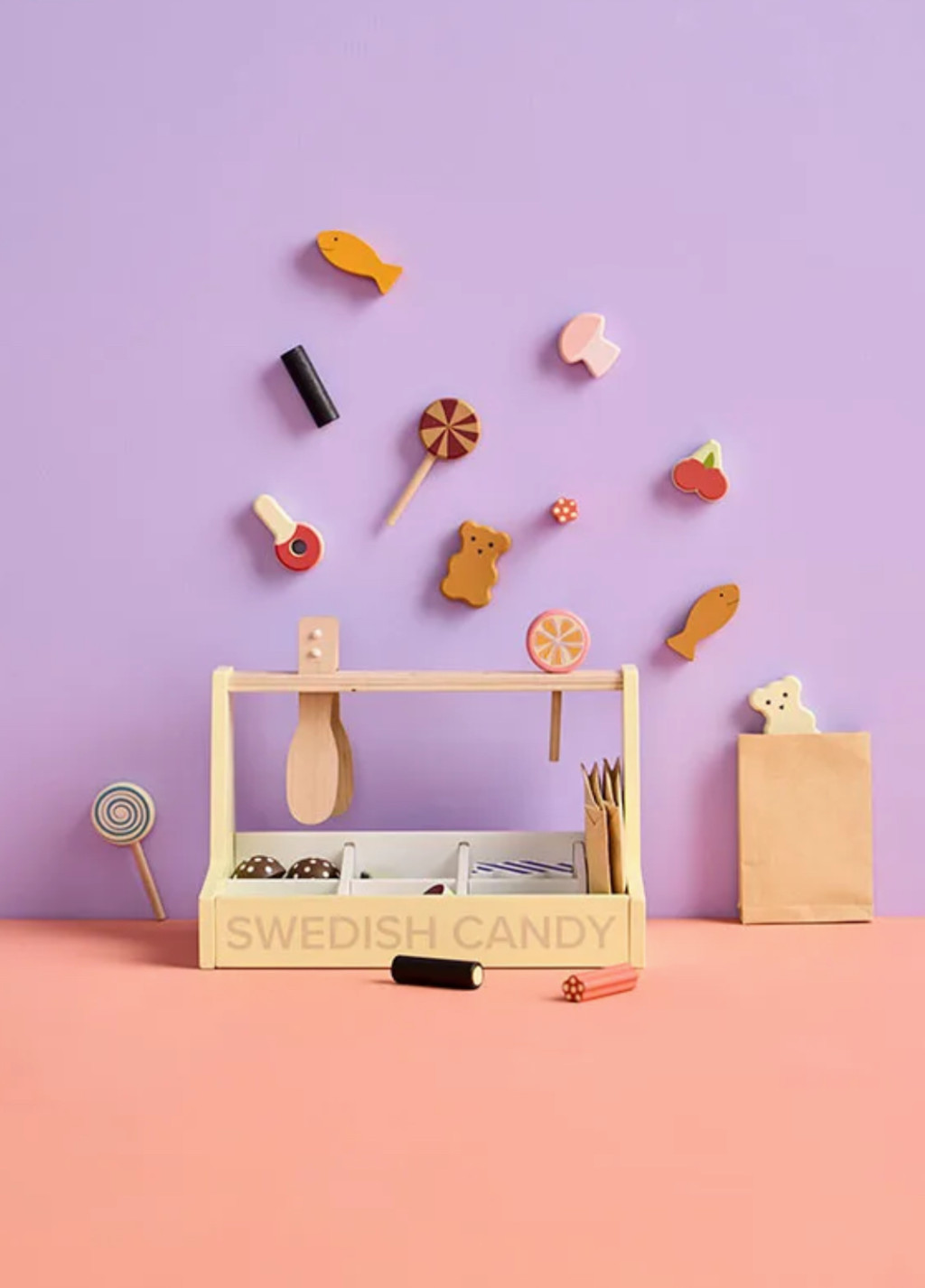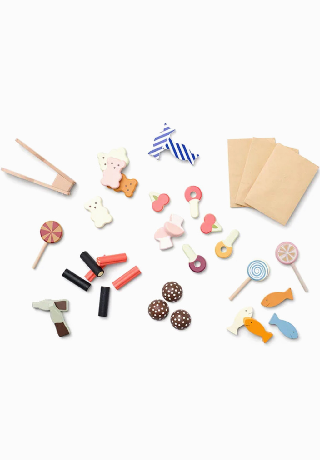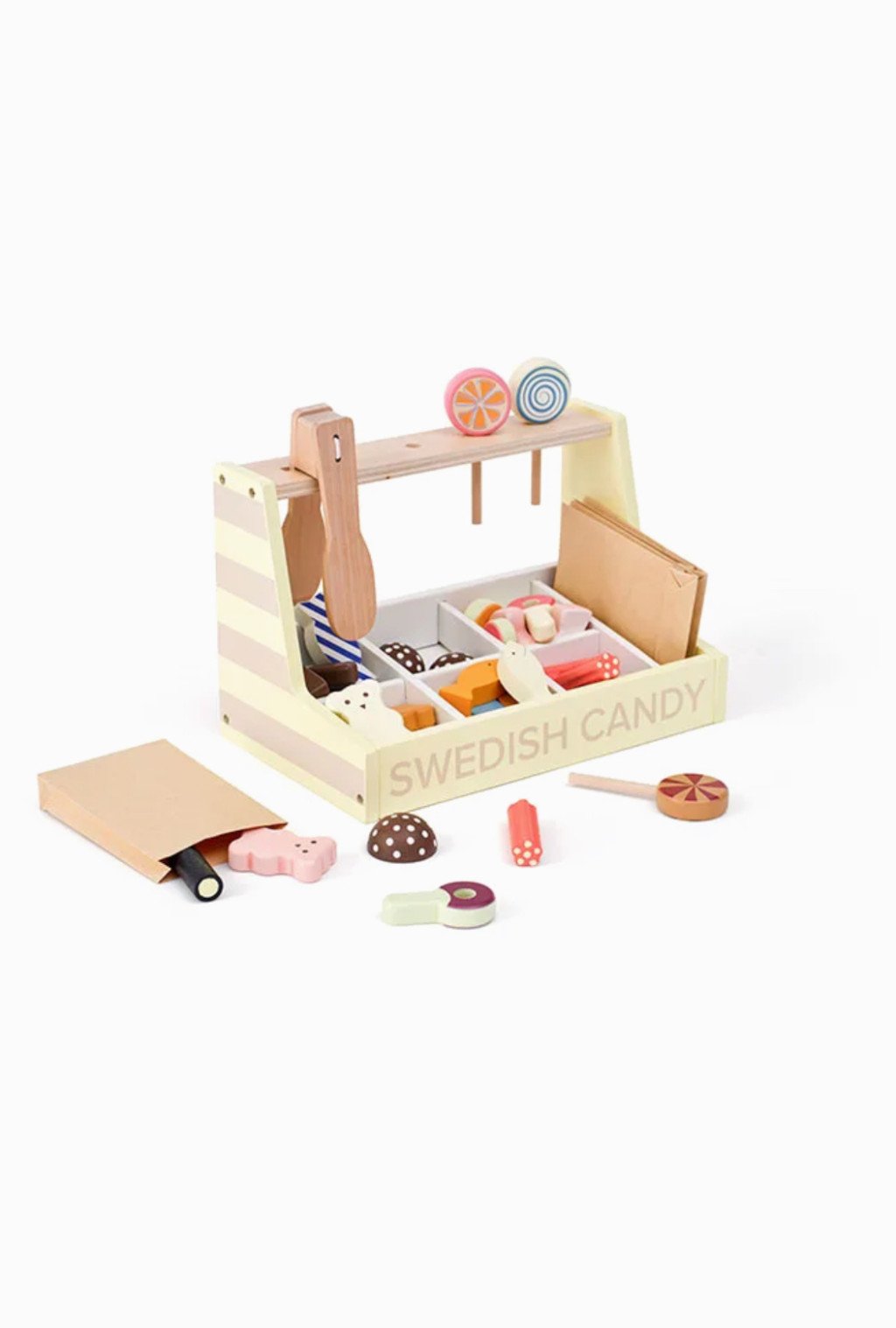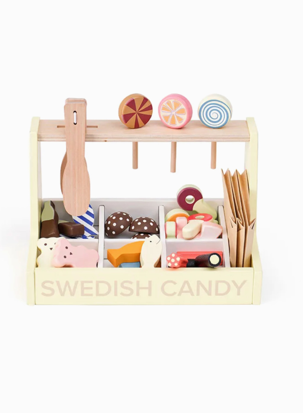 Imádjuk az édességet! A Svéd Édességbolt mostantól minden édesszájú gyerek számára nyitva áll. Édességboltunk tele van finomságokkal, mint például gumimacik, gombák, kólásüvegek, puncsos pralinék, rágós meggy és nyalókák – mind fából készültek! Ne feledkezzünk meg a cukorkarudakról, amelyek tökéletesen illenek a málnapálcikához, így szuper kombinációt alkotva. Svédországban az édességeket gyakran élvezik a hagyományos „lördagsgodis” vagy „szombati édesség” idején, amikor a családok a hét végén finomságokkal kényeztetik magukat. A merész és enyhe ízek keverékével a svéd édességek mindenki számára kínálnak valamit. A készlet tartalmaz egy édességtartót, édességfogót, három papírzacskót, három nyalókát és különféle fa édességdarabokat. A mellékelt fogó segít a gyerekeknek gyakorolni a kézmozdulataikat, miközben úgy tesznek, mintha édességet adnának el és vásárolnának, így a játékélmény lebilincselő és szórakoztató lesz. Akárcsak egy édességboltban... Ez az édességbolt fantáziadús játékra ösztönöz, lehetővé téve a gyerekek számára, hogy saját édességtörténeteket találjanak ki, és megoszthassák azokat családjukkal és barátaikkal.