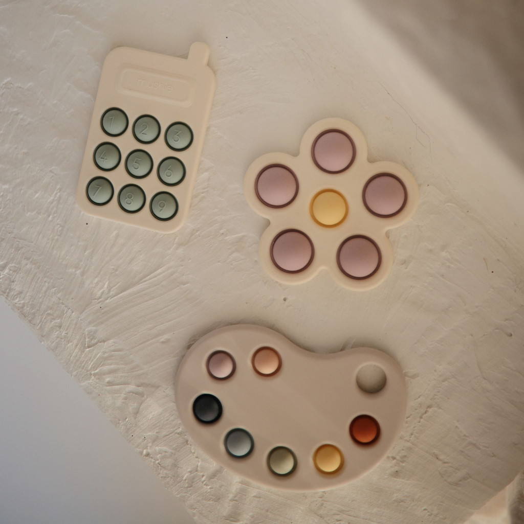 A virág formájú és telefon nyomkodós játék hasonlít a pop it! játékokhoz.