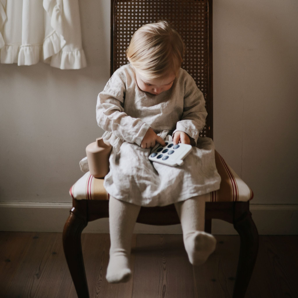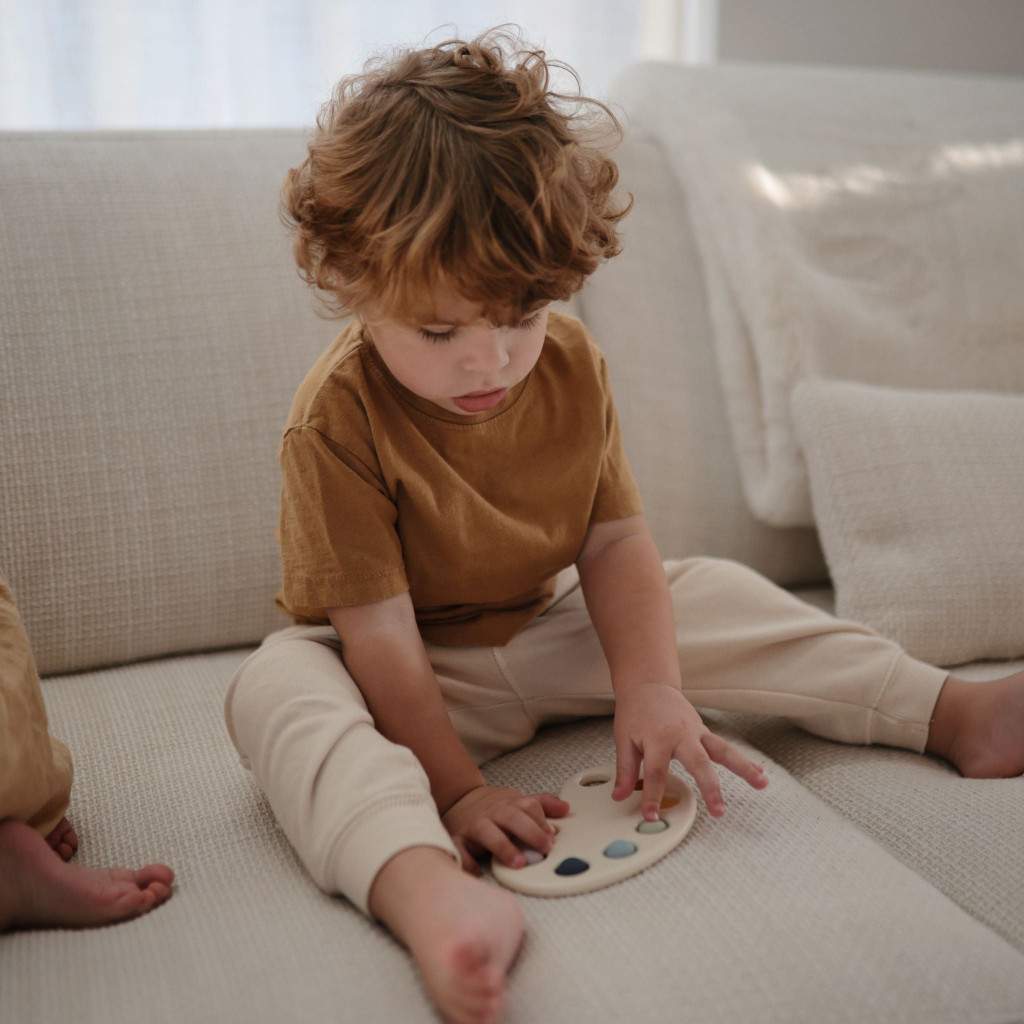 Az élelmiszeripari szilikonból készült gombok, és a BPA-mentes műanyag keret lágy színei szemet gyönyörködtetőek.