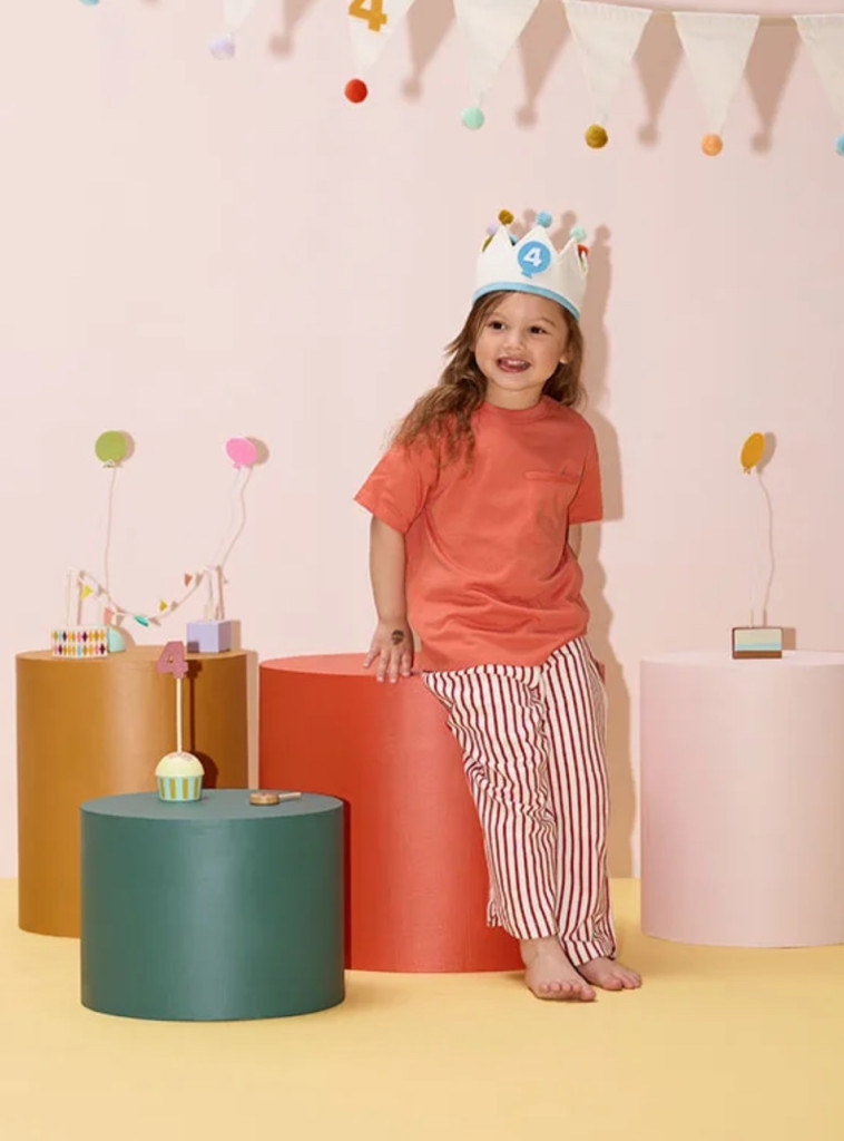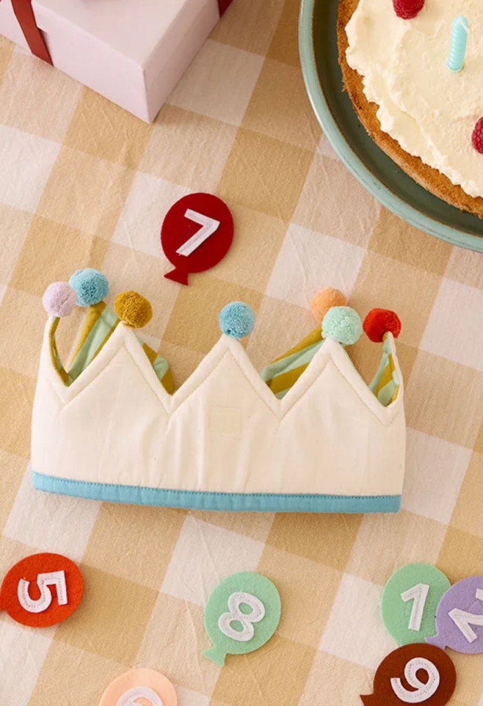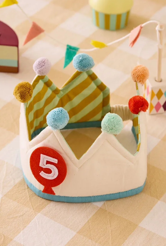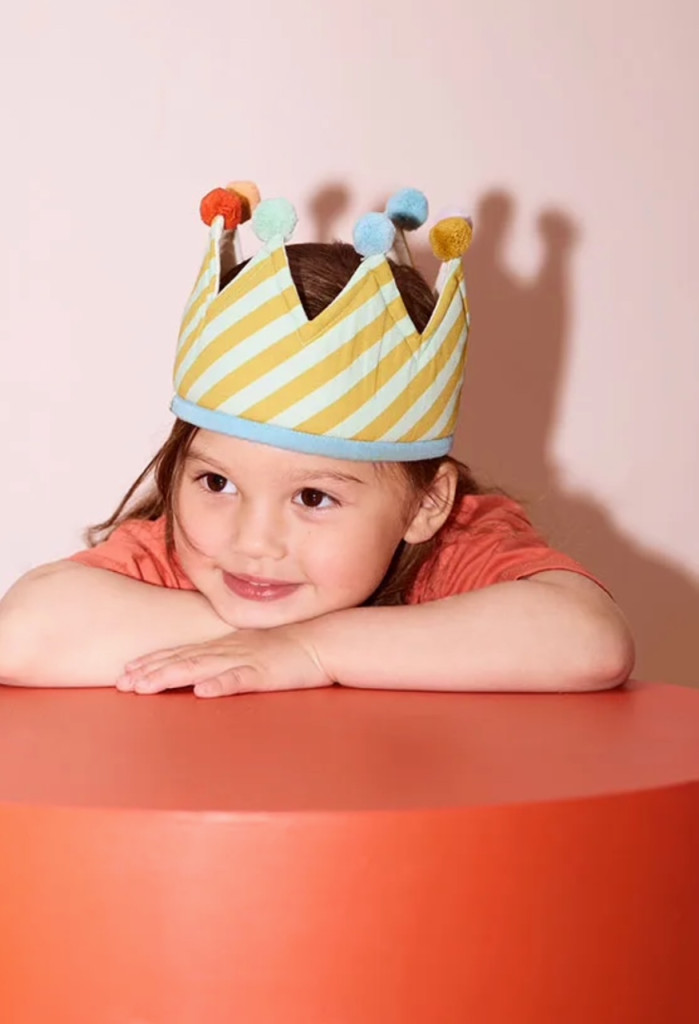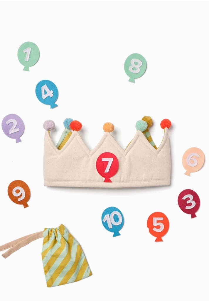 A születésnapi gyermekhez illő korona – és az évhez, amelyet ünnepelnek. Ennek az ünnepi koronának az elején van egy hely, ahová tépőzárral rögzítheti az 1-10-es számokat, így minden évben könnyen frissíthető. Belseje átlósan csíkos mintát tár fel, míg a tetejét apró pomponok díszítik a játékos érintés érdekében. A korona Öko-Tex tanúsítvánnyal rendelkezik, és kényelmesen viselhető az egész parti során. Amikor a buli véget ér, a mellékelt nyomtatott pamuttáska gondosan tárolja a számokat – készen áll a következő évi ünnepekre. Vidám módja annak, hogy évről évre megemlékezzünk a napról.