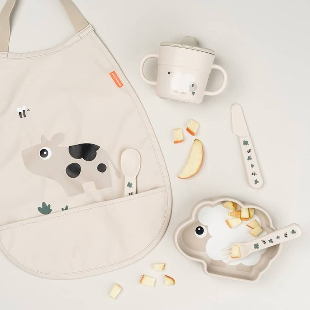 A Done by Deer Elasztikus nyakú előke, Tiny Farm, homokszínű Dotti mintával, ideális védelmet nyújt az étkezés közben. Vízlepergető felülete és praktikus zsebe egyszerűvé teszi a tisztítást. Elasztikus nyakának köszönhetően kényelmes és biztonságos a viselés.