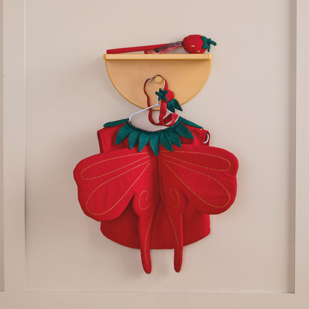 A piros színű mellény zöld, levél formájú gallérral készül, és tépőzáras kialakítása megkönnyíti a fel- és levételt. A szett része még egy hímzett tündérszárny, egy epres fejpánt, valamint egy varázspálca, amellyel akár egy egész eperkertet varázsolhatnak a gyerekek.