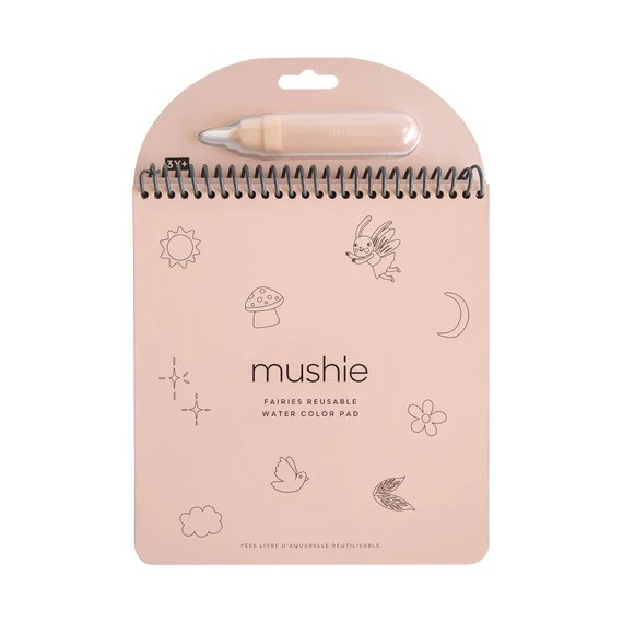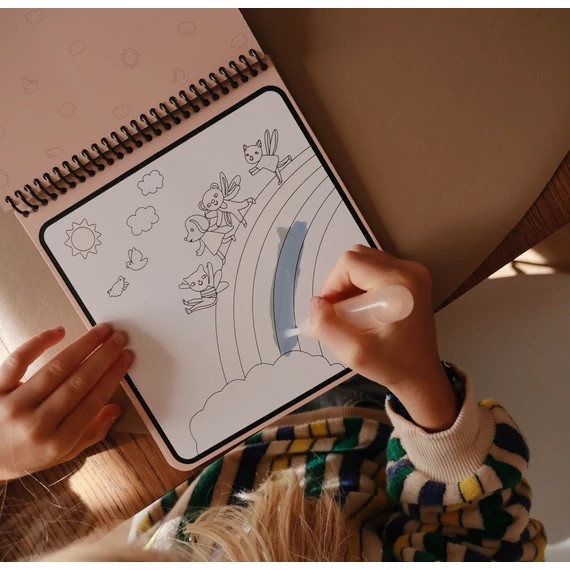 A Mushie újrahasználható vízzel festő könyv egyszerű és rendezett módon támogatja a gyerekek kreatív játékát egy négyoldalas füzettel, ami finoman illusztrált, mesés jeleneteket tartalmaz, amelyek kizárólag víz hatására színesednek ki.