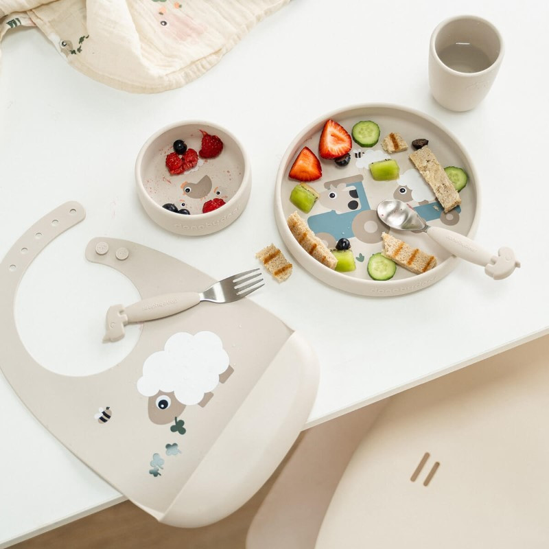 Done by Deer Szilikon tapadós étkészlet, Tiny Farm, homokszínű