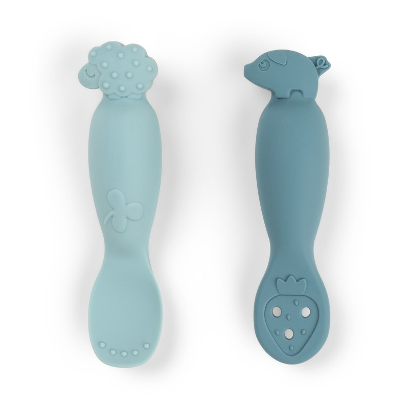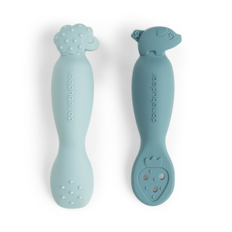 A Done by Deer Tanulókanál szett, Tiny Farm, kék tökéletes társ az önálló étkezés elsajátításához. A kétféle kialakítás – mártogatáshoz és kanalazáshoz – változatos élményt kínál, miközben ösztönzi a finommotoros készségek fejlődését. Pigee és Sheepy figurákkal díszített, puha, BPA-mentes szilikonból készült, mikróban és mosogatógépben is biztonságosan használható.