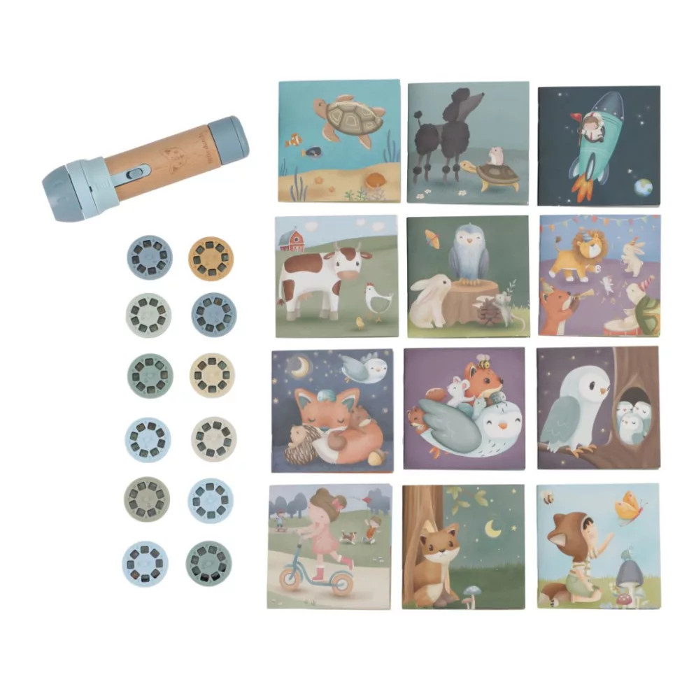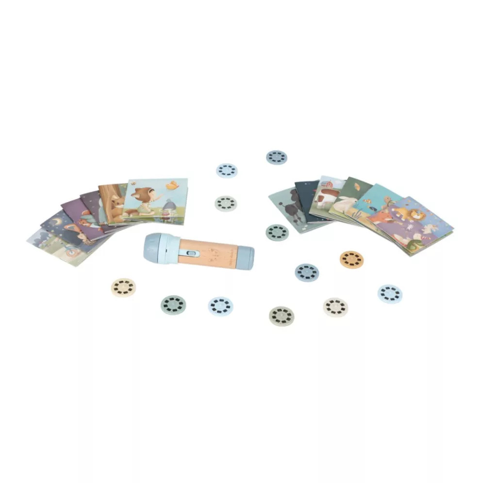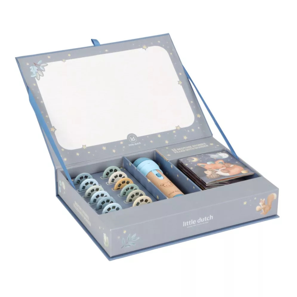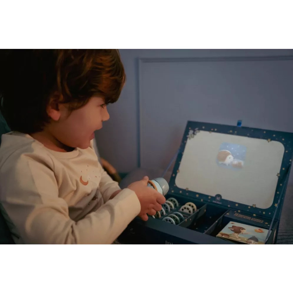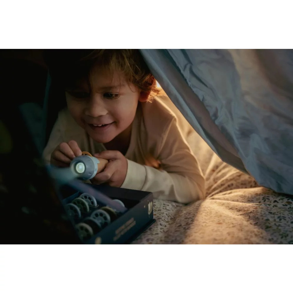 A vetítő tartós fa markolattal rendelkezik, és elemmel működik, így bárhová magatokkal vihetitek – akár egy sátras kalandhoz vagy nagyszülőknél töltött estékhez!