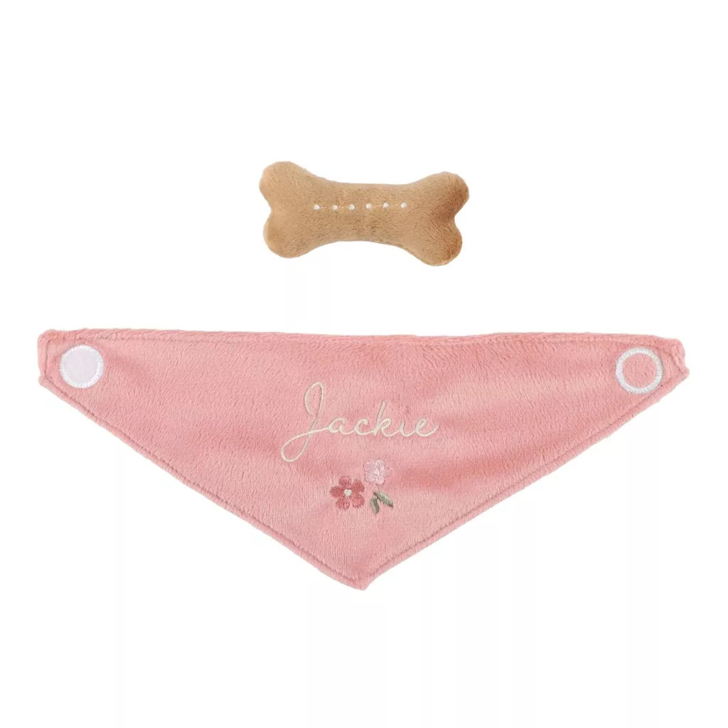A táskán elöl praktikus nyílás található, így Jackie kíváncsian kikukucskálhat belőle, miközben együtt indultok kalandozni. A szett része egy aranyos plüss csont is, hogy még teljesebb legyen a játékélmény. Igazi álom minden kis állatbarát számára!