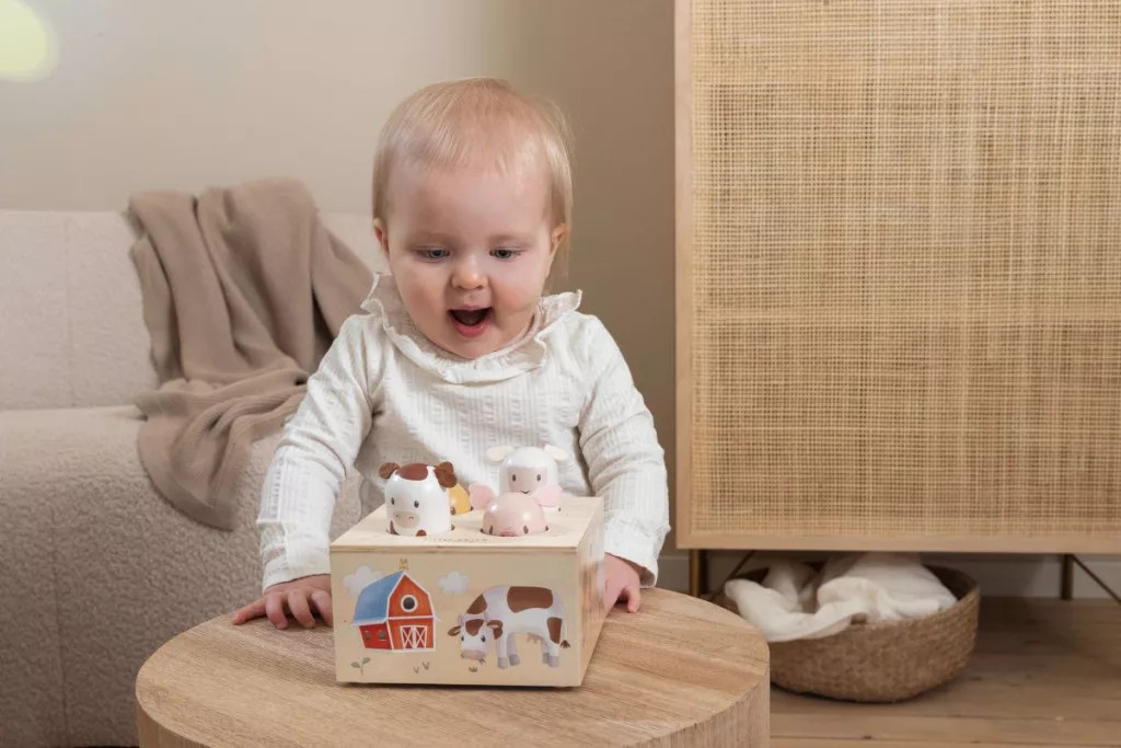 Ez a szórakoztató Little Dutch pop-up játék tökéletes választás a kicsik számára, akik élvezhetik a vidám állatokkal való játékot. A négy barátságos farmállat készen áll a játékra: egy kis nyomással egyikük eltűnik, míg a másik felbukkan! Fedezd fel az összes állatot, és ismerd meg a hangjaikat: a tehén lágy bőgését, a bárány finom bégetését, a malac röfögését és a tyúk kotkodácsolását.