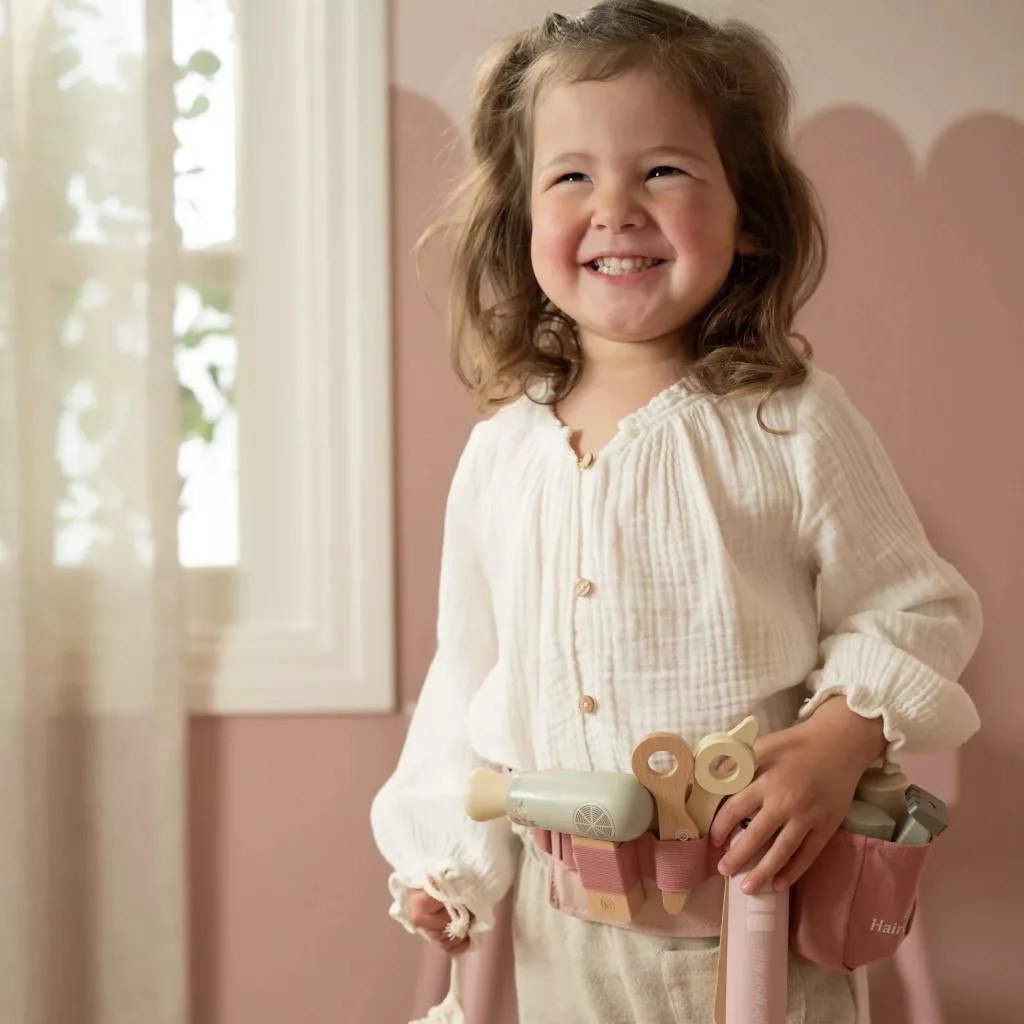 Vágás, szárítás, formázás – akár egy igazi fodrász! A Little Dutch fodrász készlet mindent tartalmaz, amire egy kis stylistnak szüksége lehet ahhoz, hogy gyönyörű frizurákat varázsoljon. A rózsaszín, állítható övtáskában minden eszköz kéznél van: játék olló, hajszárító, hajvasaló, hajnyíró, kefe, sampon, hajlakk és egy tükör.