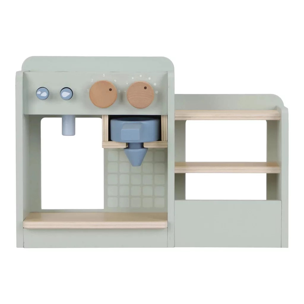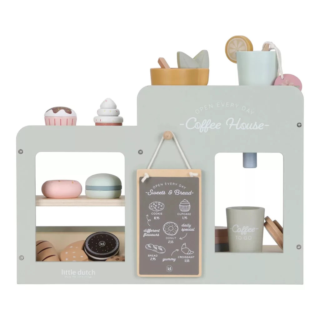 A szett tartalmaz kávé- és teafőzőt, tárolóhelyet a csészék számára, valamint egy kis vitrint, ahol szépen elrendezhetők a finomságok. A gyerekek kreatív módon gyakorolhatják a vendéglátást, miközben fejlődik a képzelőerejük, szociális készségeik és kézügyességük.