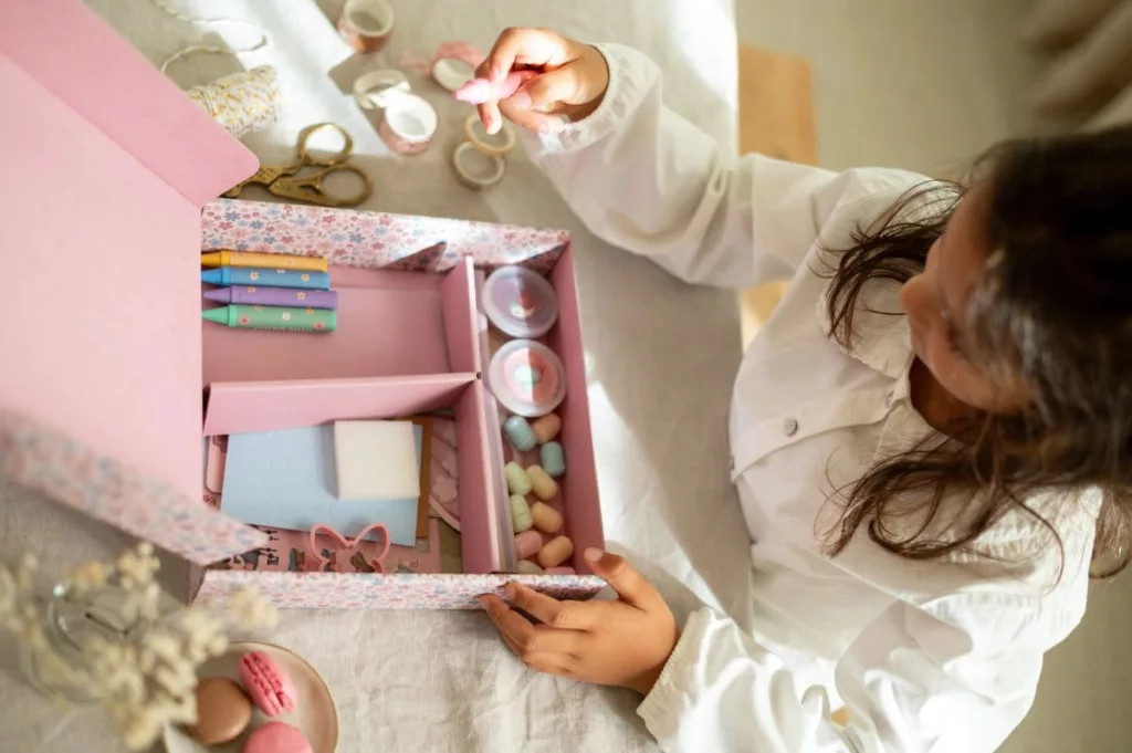 A dobozban minden megtalálható, ami csak kell a kézműveskedéshez: matricák, zsírkréták, rajzlapok, gyurma és sok más izgalmas kiegészítő. Segíti a fantázia kibontakozását és ösztönzi a kis művészeket